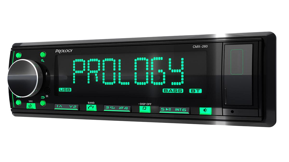PROLOGY CMX-260 — FM / USB ресивер с Bluetooth®, стандартного размера 1DIN, который обеспечивает прием радиостанций в диапазоне FM и воспроизведение медиафайлов MP3, WAV, и FLAC форматов, записанных на USB накопители, передачу звука с внешних источников через линейный аудиовход и беспроводной интерфейс Bluetooth®. Поддерживается управление мобильным телефоном через интерфейс Bluetooth® (ver. 4,2).
