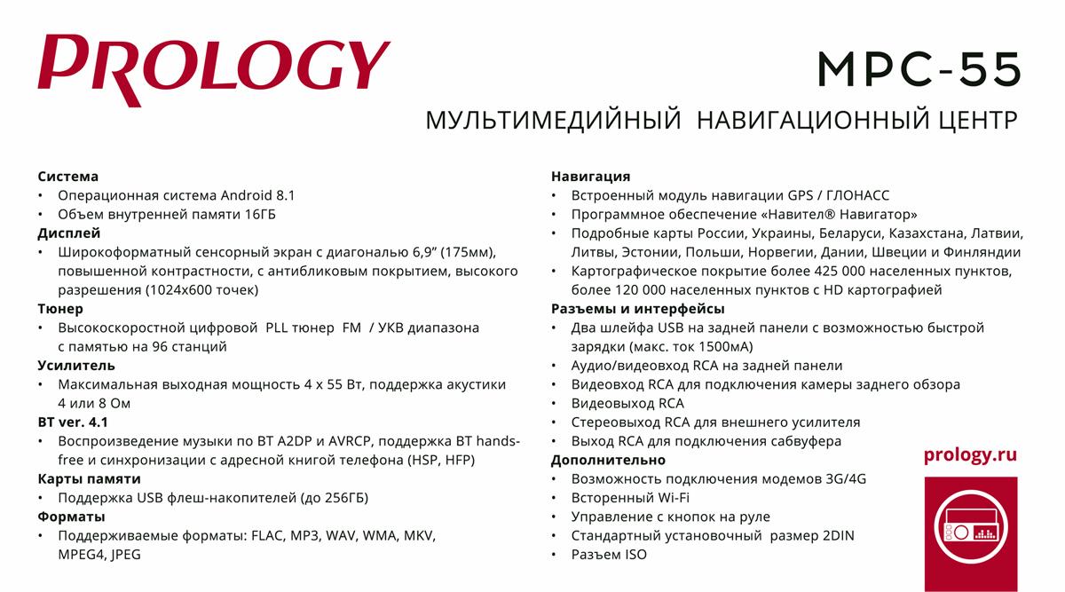 ТЕХНИЧЕСКИЕ ХАРАКТЕРИСТИКИ PROLOGY MPC-55 Android: